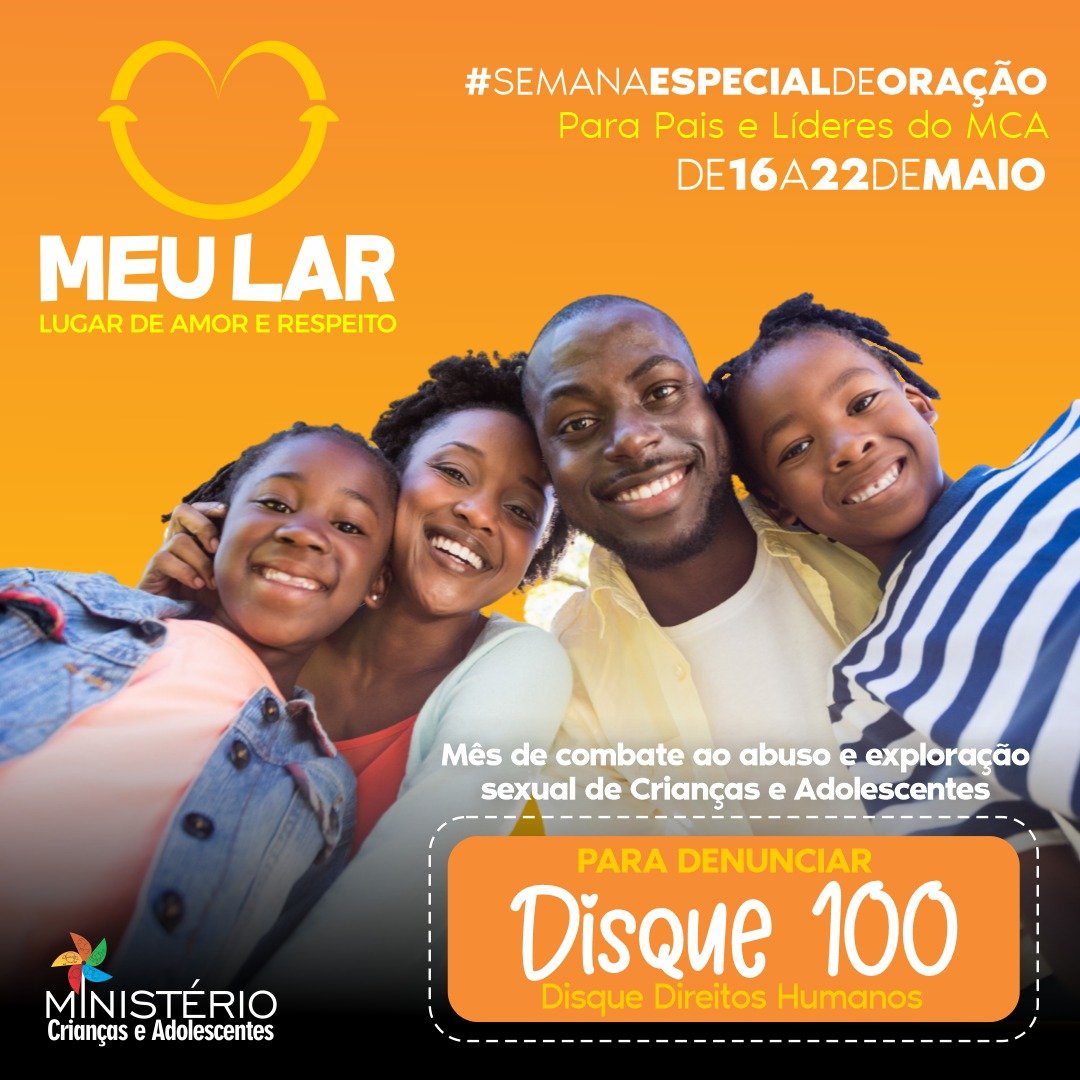 A partir deste domingo, 16, até o sábado, 22 de maio de 2021, um programa especial de oração para pais e líderes busca conscientizar sobre à violência, abuso e exploração sexual de crianças e adolescentes no país. É o programa “MEU LAR – Lugar de Amor e Respeito”. Realizado pelo Ministério de Crianças e Adolescentes (MCA Geral) da Igreja Adventista da Promessa, o programa vai massificar na igreja, o “Disque 100”, uma central nacional para denúncias de violação aos Direitos Humanos.