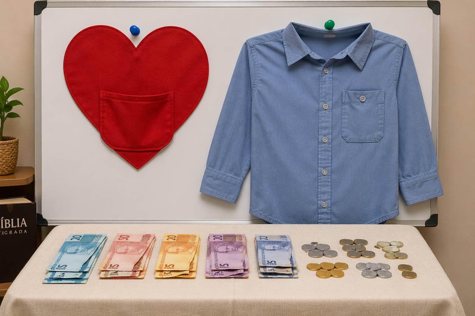 Haz un corazón con una especie de bolsillo para colocarlo en un soporte o pizarra blanca; también lleva una camisa con bolsillo y colócala en algún espacio del soporte o de la pizarra. Ten algunos billetes o monedas, o incluso dinero de imitación, y colócalos sobre una mesa.