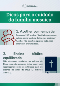 Preparamos uma imagem explicativa, extraída do item 2, que mostra as dicas para o cuidado da família mosaico (Ao fim do texto, baixe a imagem).