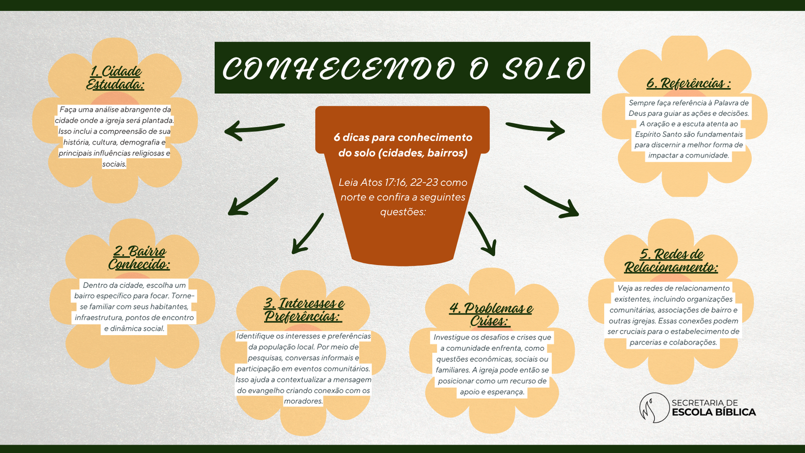 Para ajudar na visualização do item 2, utilize o mapa mental “Conhecendo o solo”. Ele destaca 6 dicas que ajudam a nortear a plantação de igreja. Insira o conteúdo nos slides, imprima ou envie para o WhatsApp dos seus alunos. Abaixo, confira o mapa mental: