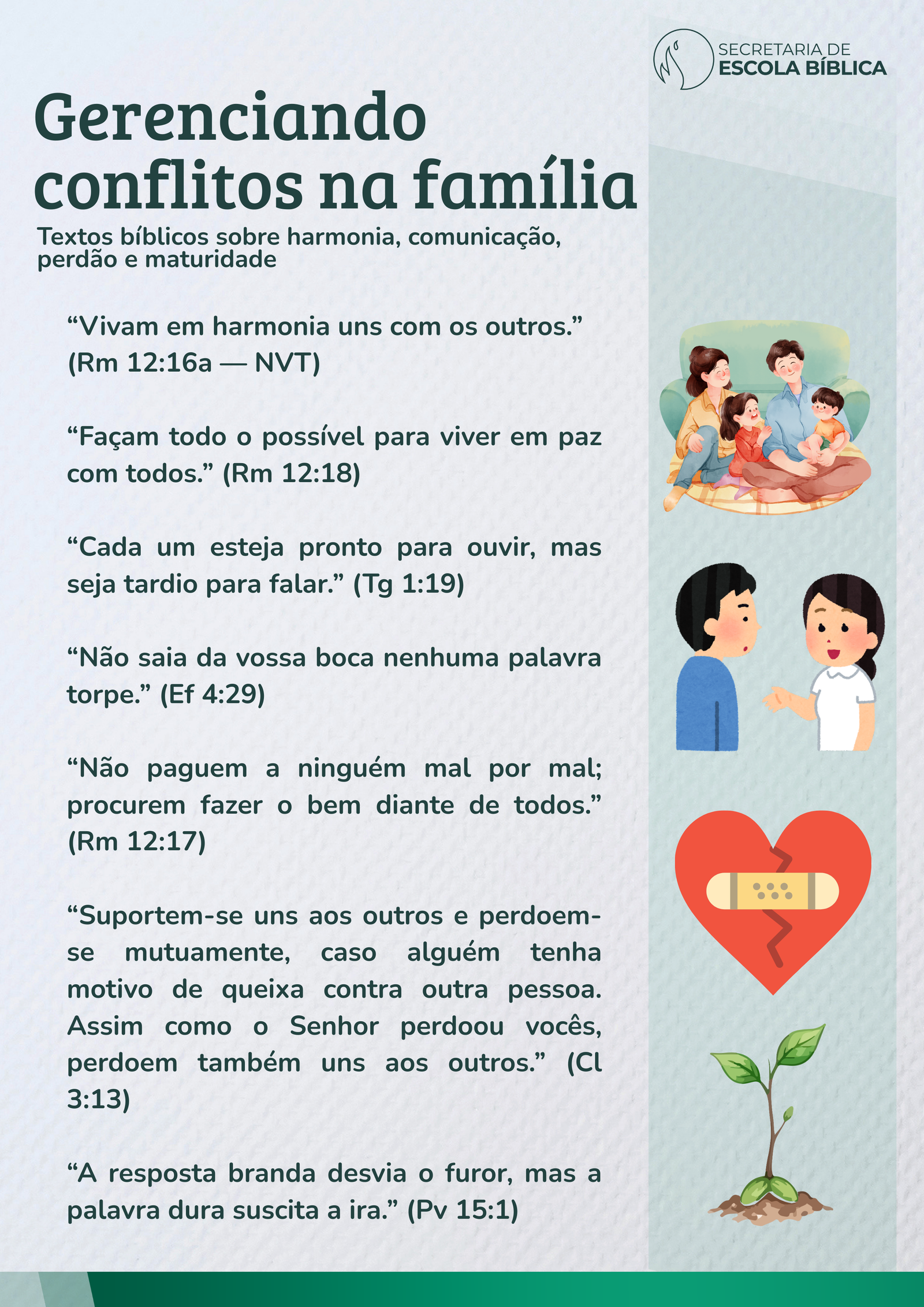 Preparamos uma imagem (abaixo) com textos bíblicos sobre harmonia, comunicação, perdão e maturidade na família. Você pode mostrar nos slides e imprimir exemplares para seus alunos, além de enviar a imagem nos grupos. Analise cada texto na hora da aula; diga para que os alunos levem a imagem para casa e reflitam com sua família ao decorrer da semana, aplicando as situações vividas no seu cotidiano, durante momentos de devoção e conversas.